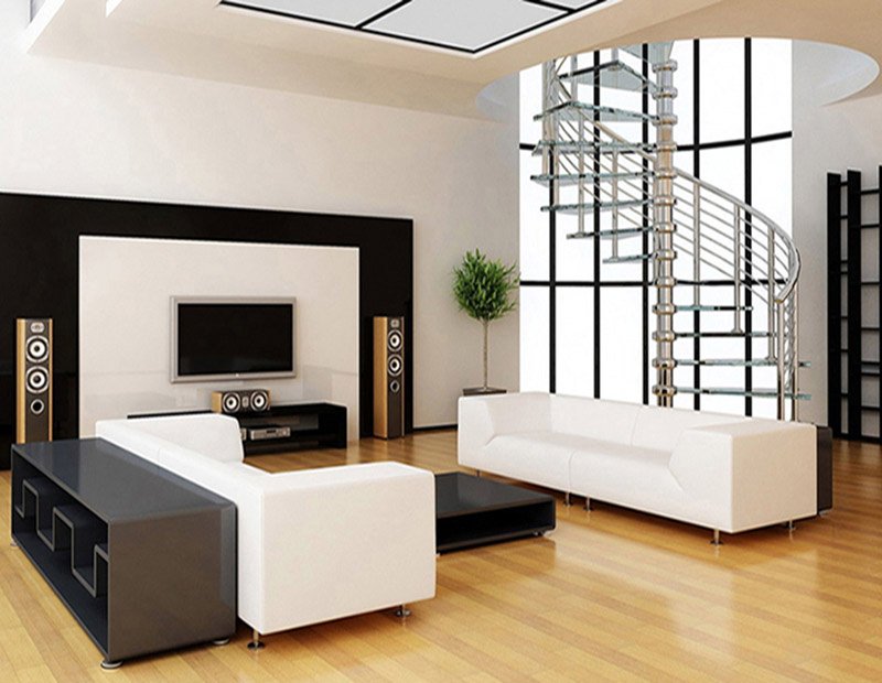 Well-lit modern living room featuring recessed ceiling lights, white walls, a fireplace, seating area, and a staircase leading upstairs.