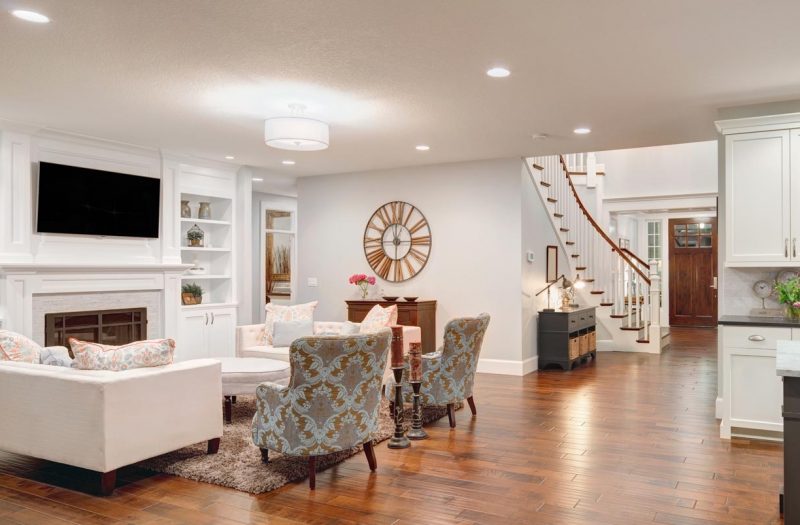 Interior of a modern home showing a spacious living room with recessed lighting, a fireplace, built-in shelving, upholstered chairs, and a staircase with wooden steps and white railing.